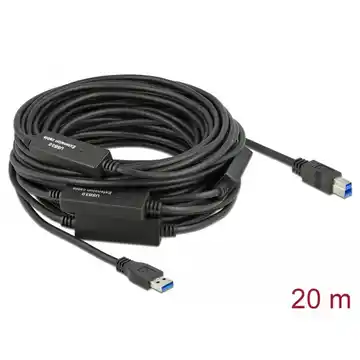 Aktywny kabel USB Delock z wzmacniaczem sygnału umożliwia przesył danych USB Typ-B do USB Typ-A z prędkością 5 Gbps. Dzięki czterem wzmacniaczom sygnału i dołączonemu zasilaczowi, zapewnia stabilną transmisję na dużych odległościach. Kabel ma długość 20 m, obsługuje standard USB 3.2 Gen 1 i posiada diodę LED wskazującą status.