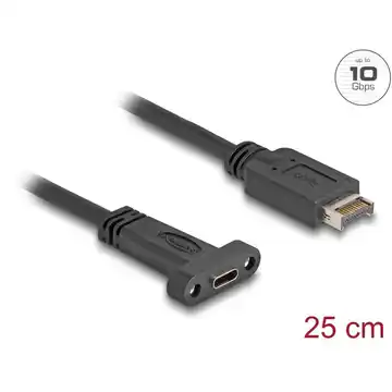 Kabel Delock umożliwia podłączenie do wewnętrznego gniazda USB Type-E Key A 10 Gbps na płycie głównej lub karcie PCI Express, a także służy do przedłużania połączenia USB. Złącze USB typu C jest montowane za pomocą śrub, umożliwiając instalację w dogodnym miejscu. Kabel zapewnia szybki transfer danych oraz zasilanie 5V / 1,5A.
