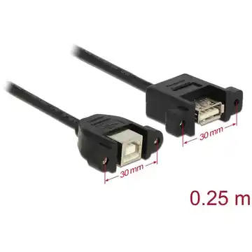 Przewód Delock umożliwia rozbudowę połączeń USB 2.0 z portami Typ-B oraz Typ-A, pozwalając na podłączenie różnych urządzeń. Złącza żeńskie montowane są za pomocą śrubek, co umożliwia łatwą instalację w wybranym miejscu, np. na uchwycie gniazda, w kanale na przewody lub do obudowy. Przewód zapewnia transmisję danych do 480 Mbps.