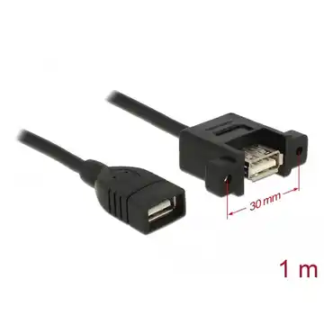 Przewód Delock umożliwia rozbudowę połączeń USB, pozwalając na łatwe podłączanie różnych urządzeń. Port żeński można przymocować za pomocą śrubek, co zapewnia stabilną instalację w różnych miejscach, takich jak uchwyt gniazda, kanał na przewody lub obudowa. Kabel zapewnia transmisję danych do 480 Mb/s i ma długość około 1 m.