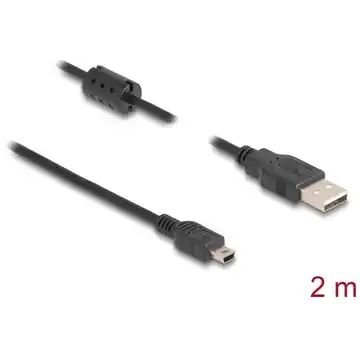 Przewód USB Delock umożliwia połączenie urządzenia ze złączem Mini USB z komputerem lub laptopem. Dzięki solidnej budowie oraz podwójnemu ekranowaniu kabla zapewnia stabilną transmisję danych do 480 Mb/s, a także odporność na zakłócenia. Przewód ma długość 2 m i czarną konstrukcję, co sprawia, że jest idealnym rozwiązaniem do codziennego użytku.