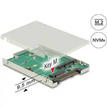 Konwerter M.2 pozwala na wykorzystanie dysków SSD M.2 PCIe, SATA oraz mSATA jako zamienników dla tradycyjnych nośników 2,5 cala. Urządzenie obsługuje złącza U.2 SFF-8639 i SATA Express oraz różne formaty dysków, zapewniając bezpieczną i wygodną eksploatację dzięki zabezpieczeniom i wskaźnikowi LED.