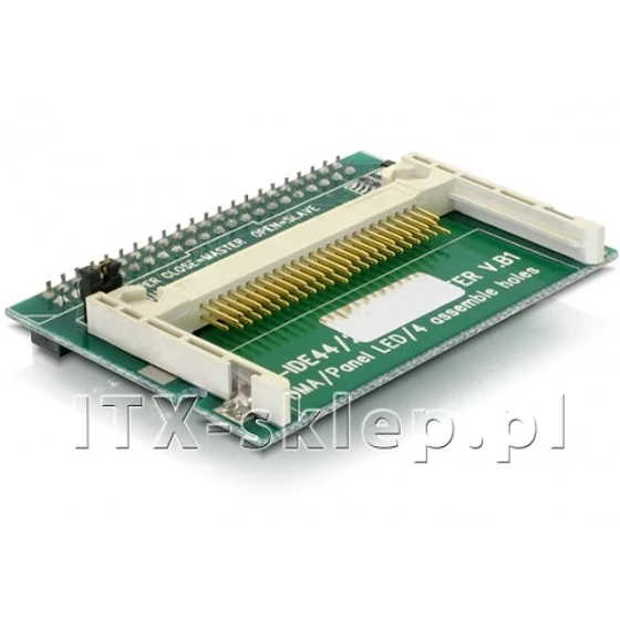 Adapter IDE 44PIN -> Compact Flash pozwalający podłączyć poziomo kartę Compact Flash do gniazda IDE 44 PIN. Dzięki obsłudze funkcji bootowania pozwala w pełni zastąpić standardowy dysk twardy. Zastosowanie adaptera umożliwia zainstalowanie dowolnego systemu operacyjnego. Przejściówka podłączana jest bezpośrednio do płyty posiadającej złącze IDE 44pin (np. Intel D945GSEJT - wówczas adapter wystaje na zewnątrz płyty).