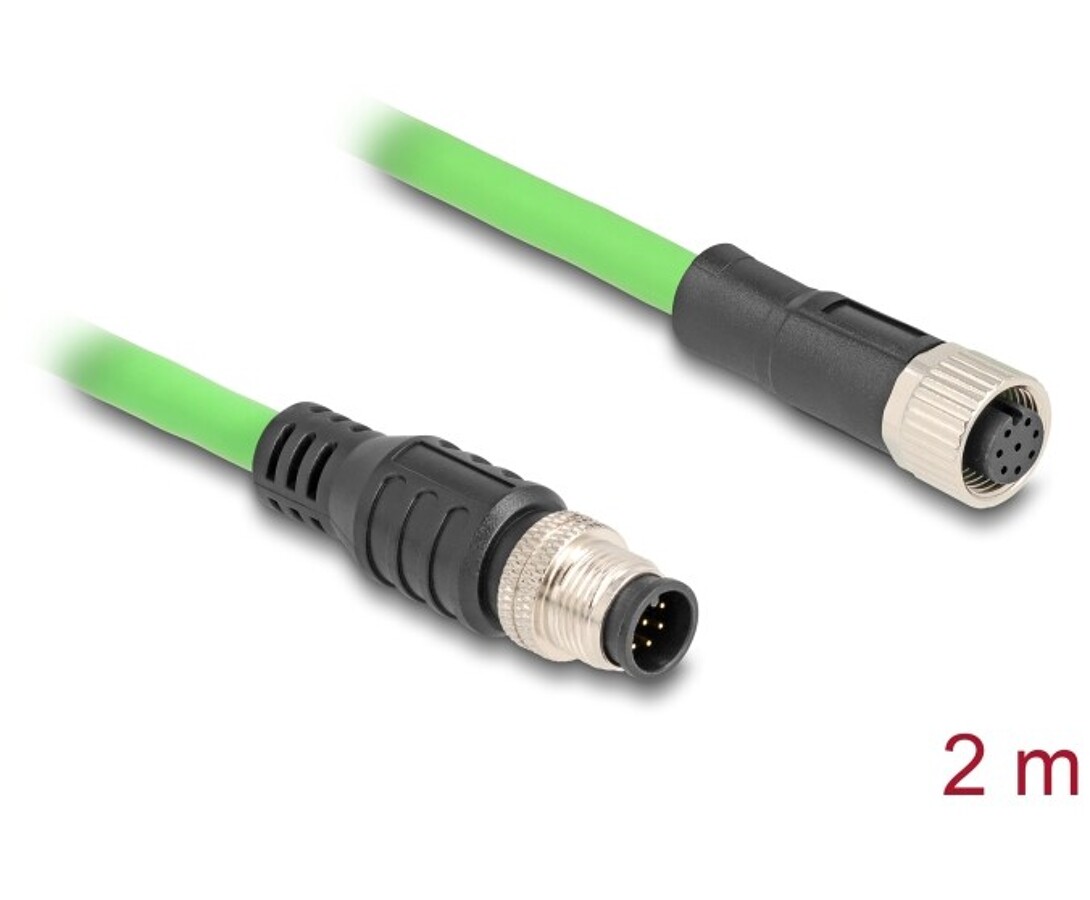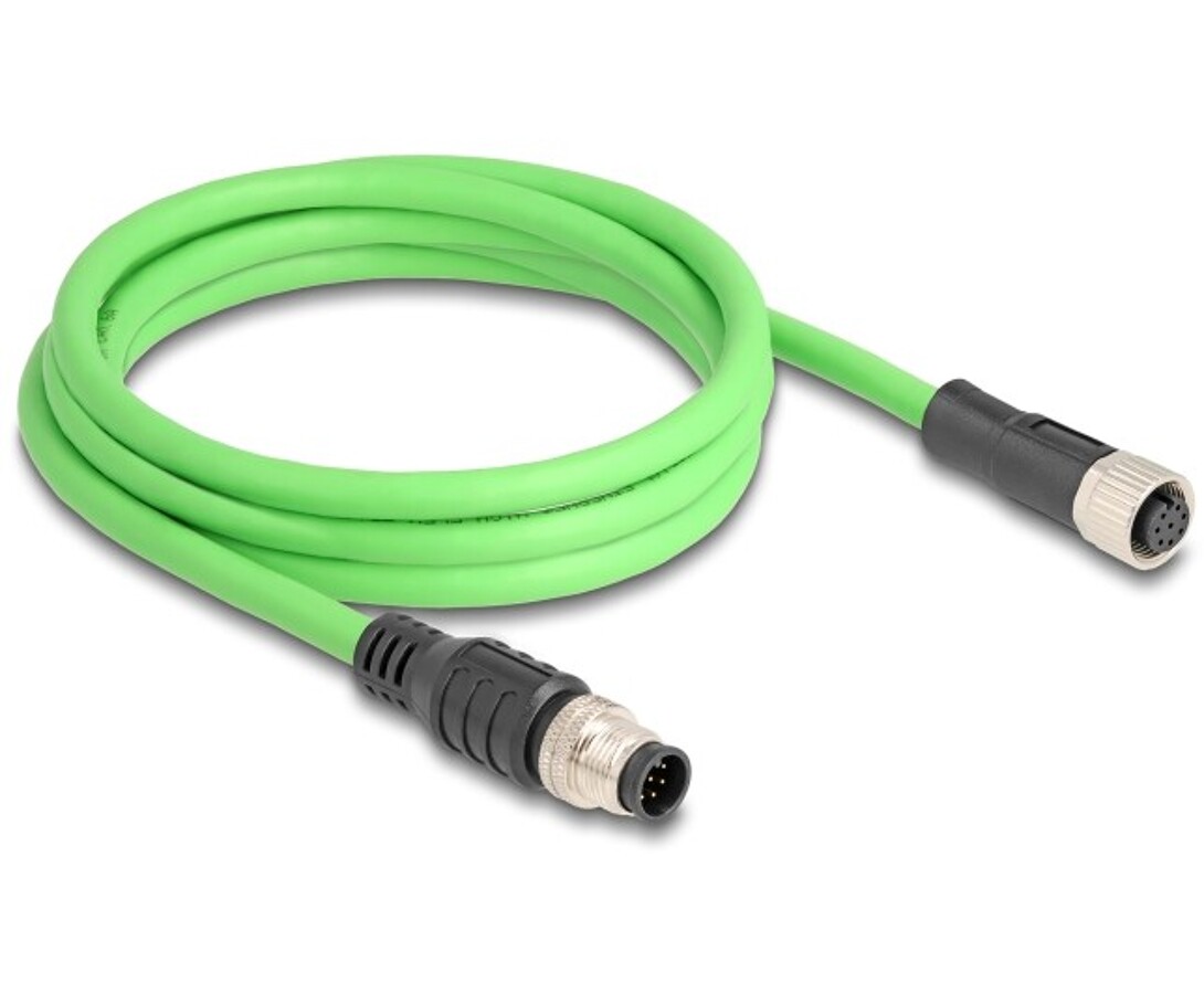 Przemysłowy przewód Ethernet M12 A-coded 8-pinowy męski–żeński Delock przeznaczony do zastosowań w automatyce, czujnikach i systemach sterowania. Dzięki ekranowaniu SF/UTP oraz powłoce PUR (TPU) odporny jest na zakłócenia, oleje i promieniowanie UV, co zapewnia trwałość oraz niezawodną transmisję danych w środowiskach przemysłowych.