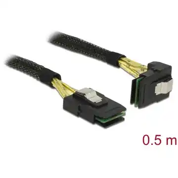 Przewód SAS marki Delock umożliwia podłączenie urządzeń wewnętrznych, takich jak płyta montażowa z złączem Mini SAS SFF-8087, do kontrolera z takim samym złączem Mini SAS SFF-8087 (kątowym). Obsługuje specyfikację Serial Attached SCSI (SAS) z prędkością transmisji do 6 Gb/s. Kabel o grubości 30 AWG ma długość około 0,5 m.