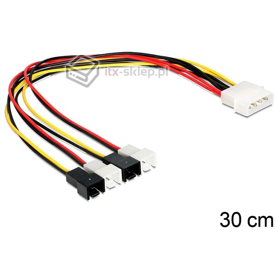 Rozdzielacz zasilania 4PIN - 4x 2PIN pozwalający podłączyć cztery wentylatory do jednej wtyczki Molex. Wszystkie wentylatory będą pracowały z tą samą prędkością obrotową. Długość przewodu wynosi ~30cm.