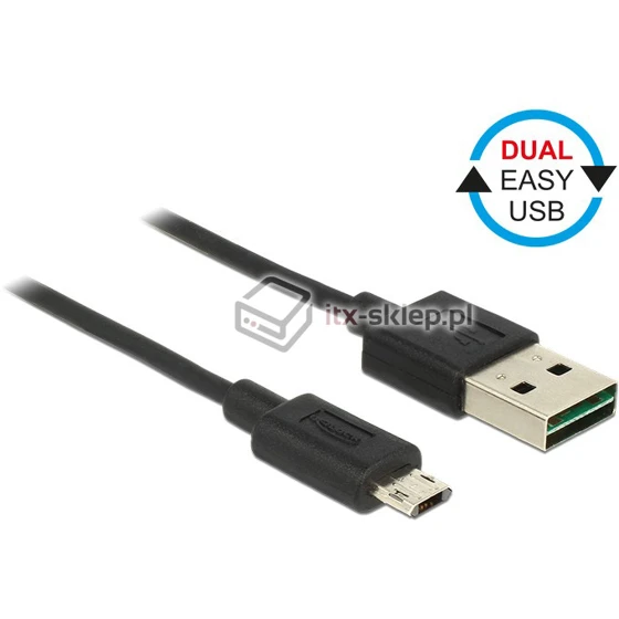 Wysokiej jakości kabel USB 2.0-A męski > USB micro-B męski firmy Delock wykonany w standardzie EASY-USB - podłączenie możliwe bez konieczności obracania wtyczek z obu stron. Prezentowany produkt umożliwia podpięcie wszystkich urządzeń wyposażonych w gniazdo micro-B (smartfony, lustrzanki cyfrowe, kamery video). Średnica kabla: linia zasilania 24 AWG, linia danych 32 AWG. Końcówki pozłacane, długość 50cm, kolor czarny.