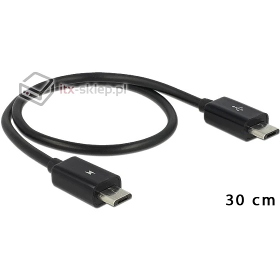 Wysokiej jakości kabel OTG USB micro-B -> micro-B o długości 30cm firmy Delock ze wsparciem dla funkcji OTG (On-The-Go) przydatnej w urządzeniach mobilnych. Pozwala na bezpośrednie zasilenie smartfona, tabletu, zegarka inteligentnego, odtwarzacza MP3 z innego urządzenia mobilnego za pośrednictwem złącza OTG. Wymagane jest, aby ładowane urządzenie było wyposażone jedynie w gniazdo Micro USB, natomiast urządzenie podstawowe obsługiwało standard OTG.