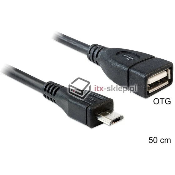 Wysokiej jakości kabel OTG USB micro-B -> USB 2.0 o długości większej niż standardowo (50cm) firmy Delock ze wsparciem dla funkcji OTG (On-The-Go) przydatnej w urządzeniach mobilnych (np. telefony, smartphony, tablety). Pozwala na bezpośrednie podłączenie dysku twardego 2,5" lub pamięci Flash typu pendrive do urządzenia mobilnego bez użycia komputera!