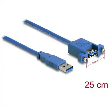 Przewód Delock pozwala na rozbudowę połączeń USB, umożliwiając łatwe podłączanie urządzeń. Porty żeńskie można zamocować za pomocą śrubek, co ułatwia instalację w dogodnym miejscu, np. na uchwycie gniazda, kanale na przewody lub obudowie. Kabel zapewnia transmisję danych do 5 Gbps i ma długość około 1 m.