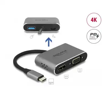 Adapter Delock umożliwia podłączenie monitora HDMI lub VGA do komputera z interfejsem USB typu C obsługującym tryb DisplayPort Alternate Mode. Obsługuje jednoczesne połączenie dwóch monitorów i umożliwia podłączenie urządzeń peryferyjnych przez port USB 3.2. Dzięki funkcji Power Delivery adapter zapewnia zasilanie laptopa lub tabletu do 87 W.