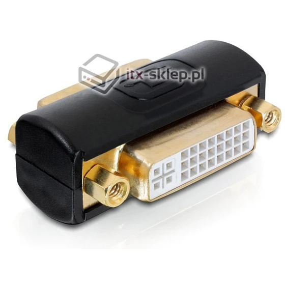 Wysokiej jakości adapter DVI 24+5 pin żeńsko (F) - żeński (F) firmy Delock pozwalający zmienić typ gniazda DVI z męskiego na żeński. Złącza pozłacane, przejściówka możliwość przykręcenia wtyczek.