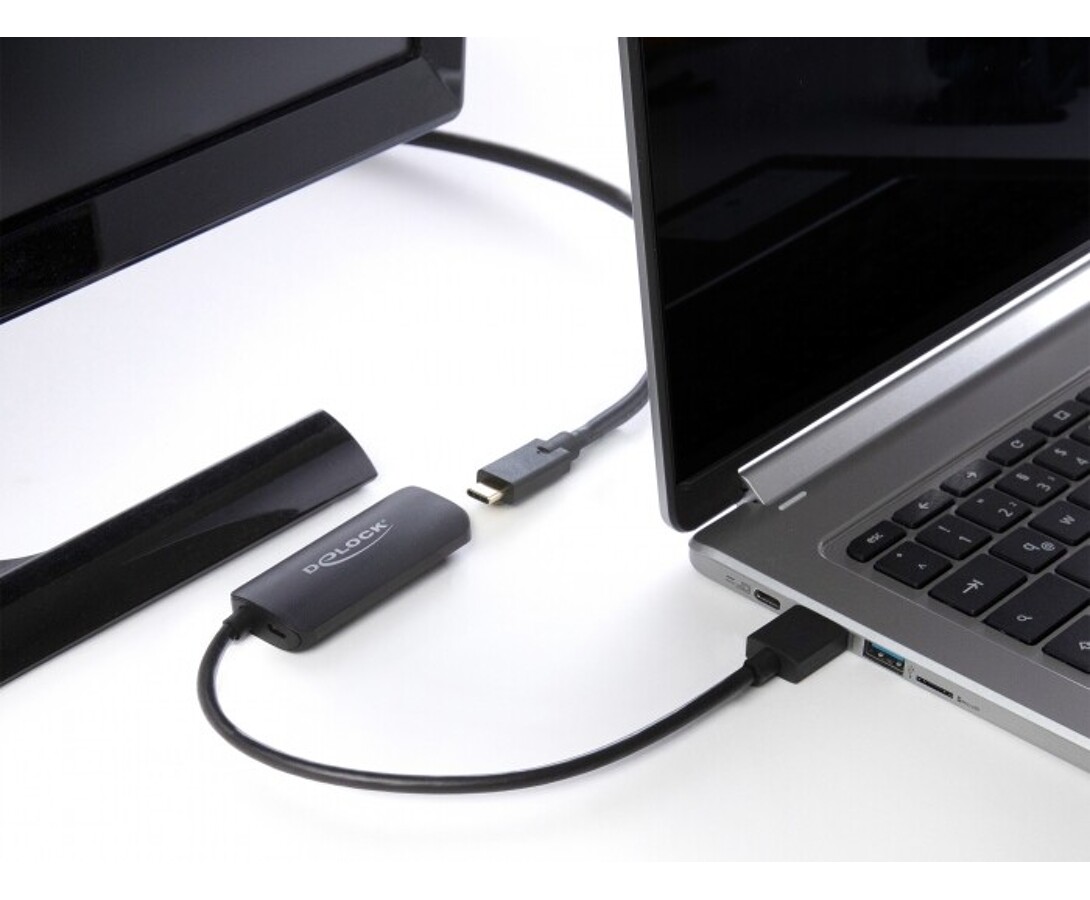 Adapter Delock umożliwia podłączenie monitora z interfejsem USB typu C (obsługującym tryb DisplayPort Alternate Mode) do komputera lub laptopa wyposażonego w wolny port HDMI. Połączenie z monitorem realizowane jest za pomocą posiadanego kabla USB-C. Urządzenie wspiera przesył sygnałów audio i wideo oraz oferuje obsługę nowoczesnych standardów obrazu, takich jak HDR, 3D czy rozdzielczość do 8K.