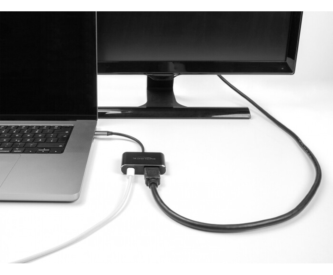 Adapter Delock umożliwia podłączenie monitora z interfejsem USB typu C do komputera lub laptopa za pomocą portu HDMI. Obsługuje rozdzielczość do 3840 x 2160 przy 60 Hz, a dzięki funkcji USB Power Delivery umożliwia ładowanie urządzeń do 100 W, oferując wygodne przesyłanie sygnału i zasilanie w jednym.