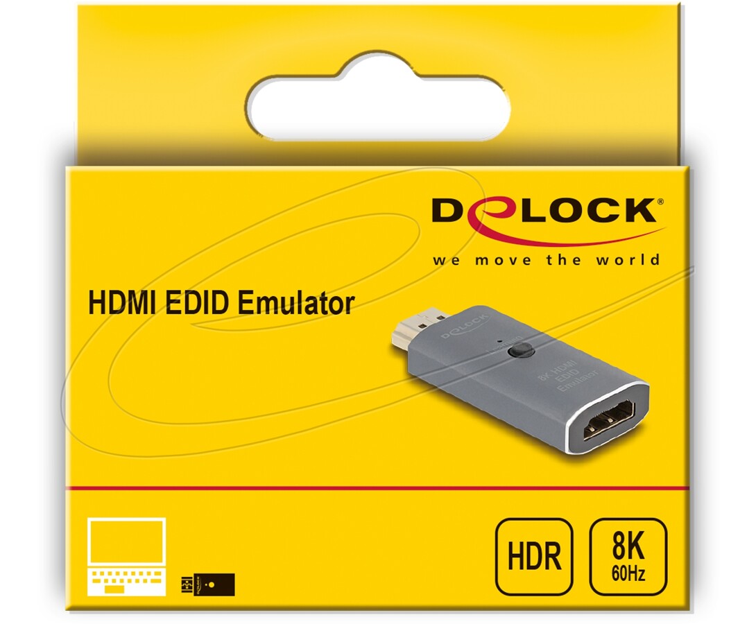 Adapter Delock emuluje obecność monitora, co zapobiega wyłączaniu się źródła sygnału lub zmianie rozdzielczości nawet przy braku fizycznie podłączonego wyświetlacza. Wyposażony w standardowy zestaw danych EDID/DDC, umożliwia również odczyt i zapis danych z monitora. Obsługuje wysoką rozdzielczość 8K oraz technologie HDR i HDCP. Metalowa obudowa oraz wskaźnik LED zapewniają trwałość i łatwą kontrolę działania.
