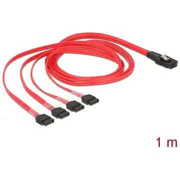 Kabel SAS marki Delock umożliwia łączenie wewnętrznych urządzeń SAS, takich jak kontroler z złączem Mini SAS, z 4 dyskami twardymi z gniazdem SATA. Obsługuje specyfikację Serial Attached SCSI (SAS) i ma długość około 1 m.