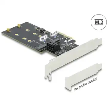 Karta PCI Express marki Delock rozbudowuje komputer o trzy porty SATA oraz dwa sloty M.2, umożliwiając instalację dysków SSD, HDD i modułów M.2. Wspiera funkcje NCQ, TRIM, S.M.A.R.T. oraz DevSleep, zapewniając wysoką wydajność, bezpieczeństwo danych i możliwość uruchamiania systemu z podłączonych urządzeń.