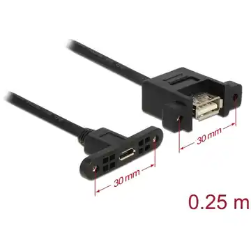 Kabel USB 2.0 Delock umożliwia przedłużenie połączenia i podłączenie różnych urządzeń za pomocą portów z nakrętkami do montażu. Złącze żeńskie można łatwo zamontować na uchwycie slotowym, kanale kablowym lub obudowie z odpowiednim otworem, co pozwala na wygodne zainstalowanie portu w łatwo dostępnym miejscu.