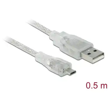 Przewód USB Delock łączy urządzenie ze złączem Micro USB z komputerem lub laptopem. Dzięki solidnej konstrukcji, podwójnemu ekranowaniu oraz rdzeniowi ferrytowemu zapewnia stabilną transmisję danych do 480 Mb/s oraz ochronę przed zakłóceniami. Przewód ma długość 0,5 m i przezroczystą konstrukcję.