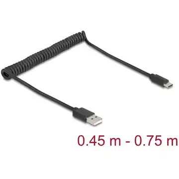 Kabel spiralny USB Delock łączy różne urządzenia USB za pomocą złącz USB 2.0 Typ-A i USB typu C. Dzięki elastycznej konstrukcji łatwy do przechowywania, z regulowaną długością, jest idealnym rozwiązaniem w sytuacjach, gdy potrzebujemy mobilności i oszczędności miejsca przy zachowaniu wysokiej jakości transmisji danych.