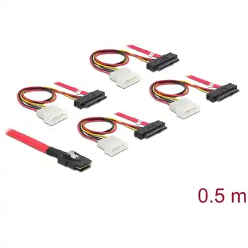 Kabel SAS marki Delock jest przeznaczony do łączenia wewnętrznych urządzeń SAS, takich jak kontroler z złączem Mini SAS, z 4 dyskami twardymi wyposażonymi w gniazdo SAS. Obsługuje specyfikację Serial Attached SCSI (SAS) z prędkością do 6 Gbps i ma długość około 0,5 m.