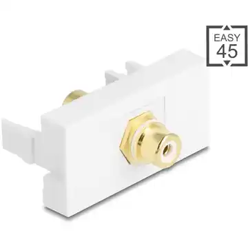 Moduł Delock Easy45 z dwoma złączami RCA żeńskimi w kolorze białym umożliwia wygodne podłączenie kabla audio w instalacjach opartych na systemie Easy45. Solidne osadzenie zapewnia mechanizm zatrzaskowy, a złocone styki gwarantują dobrą jakość transmisji.