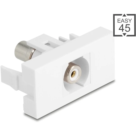 Moduł Delock Easy45 umożliwia szybkie i beznarzędziowe podłączenie kabla antenowego dzięki złączom IEC męski i F żeński. Jest kompatybilny z systemem Delock Easy45, co pozwala na jego integrację z różnymi komponentami instalacyjnymi, takimi jak gniazda zasilania czy złącza multimedialne.