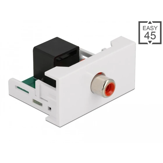 Moduł Delock Easy45 z dwoma portami RCA (żeńskimi) umożliwia łatwe połączenie audio w systemach multimedialnych. Kompatybilny z systemem Easy45, idealny do instalacji w obudowach i korytkach kablowych o głębokości co najmniej 45 mm.