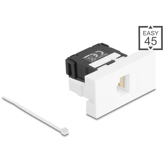 Moduł Easy45 Delock z portem RJ45 umożliwia szybkie podłączenie kabla sieciowego w systemie Delock Easy45. Wyposażony w mechanizm zatrzaskowy oraz dławik kablowy, jest kompatybilny ze standardem Cat.6A i obsługuje zarówno przewody typu solid, jak i stranded.