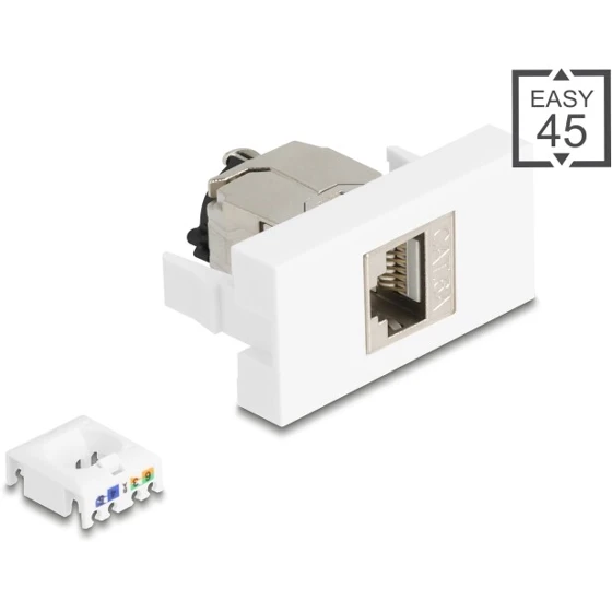 Moduł Easy45 Delock z portem RJ45 umożliwia szybkie podłączenie kabla sieciowego w systemie Delock Easy45. Wyposażony w mechanizm zatrzaskowy oraz dławik kablowy, jest kompatybilny ze standardem Cat.6A i obsługuje zarówno przewody typu solid, jak i stranded.