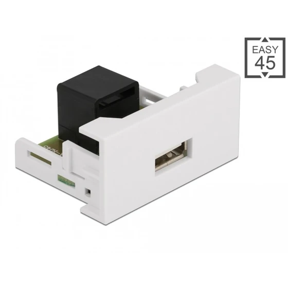 Moduł Easy45 marki Delock wyposażony w port żeński USB 2.0 Typ-A umożliwia podłączenie urządzeń peryferyjnych takich jak klawiatury, myszki, drukarki czy pamięci USB. Preinstalowany kabel sieciowy można podłączyć do gniazda RJ45, co pozwala na proste przedłużenie połączenia. Prosty mechanizm zatrzaskowy zapewnia stabilne osadzenie modułu w uchwycie, a w razie potrzeby umożliwia jego łatwe usunięcie.Easy45 to system modułowy umożliwiający instalację różnorodnych złączy, takich jak HDMI, USB czy RCA, zgodnie z zapotrzebowaniem użytkownika. Moduły Easy45 są standaryzowane i kompatybilne z szeroką gamą obudów i korytek kablowych. System zapewnia wygodne połączenie między instalacjami elektrycznymi a urządzeniami peryferyjnymi, takimi jak laptopy, monitory, telewizory i drukarki. Uwaga! Moduł nie umożliwia integracji z istniejącą siecią. Złącze USB może zostać rozszerzone za pomocą kabla sieciowego.