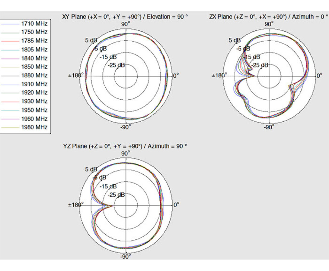 - VSWR: 698 - 791 MHz: 5,0, 824 - 960 MHz: 5,0, 1710 - 2170 MHz: 2,5, 2400 - 2500 MHz: 2,5, 2570 - 2700 MHz: 2,5, 5150 - 5875 MHz: 3,0.