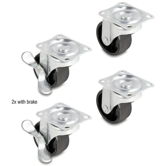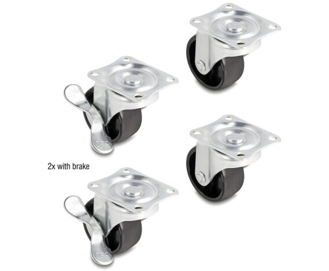 Zestaw kółek marki Delock przeznaczony jest do transportu mebli lub szaf sieciowych, zapewniając łatwą mobilność. Produkt jest idealny do zastosowań, w których konieczne jest przemieszczenie cięższych przedmiotów, takich jak szafy rackowe. Dzięki solidnej konstrukcji, zestaw kółek pozwala na bezpieczny transport urządzeń o wadze do 90 kg na kółko.