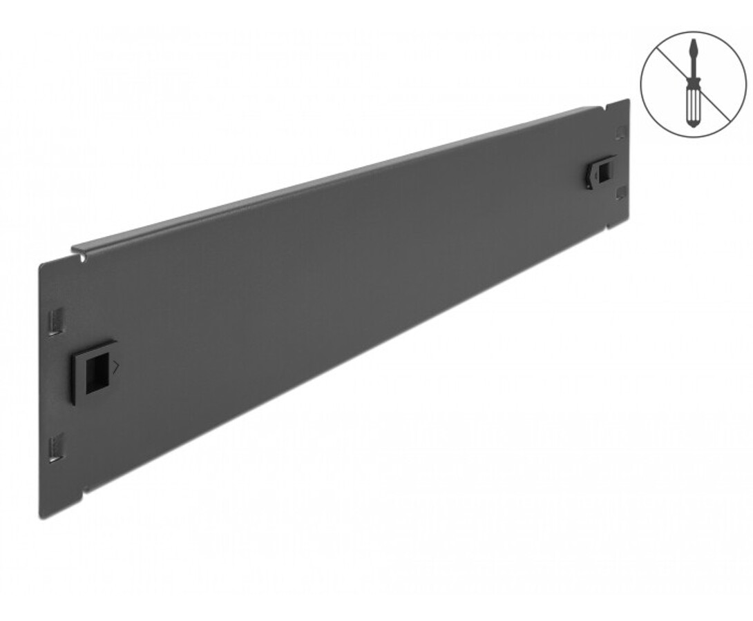 Osłona marki Delock przeznaczona jest do instalacji w szafie sieciowej 19", służy do wypełniania pustych półek, zapewniając estetykę i porządek w szafie rackowej. Produkt charakteryzuje się łatwym montażem, ponieważ nie wymaga użycia narzędzi. Zintegrowane zatrzaski montażowe umożliwiają szybkie i wygodne wpięcie panelu.