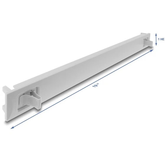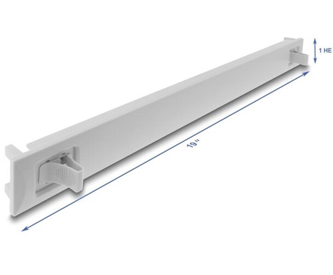Zaślepka marki Delock przeznaczona do montażu w szafie sieciowej 19", służy do zamykania otwartych przestrzeni w szafie rackowej. Montaż odbywa się bez użycia narzędzi dzięki zintegrowanemu kątownikowi montażowemu, który wystarczy wypchnąć na zewnątrz, aby zablokować panel na miejscu. Produkt wykonany z materiału ABS w kolorze szarym RAL7035, idealny do użytku w szafach 19".