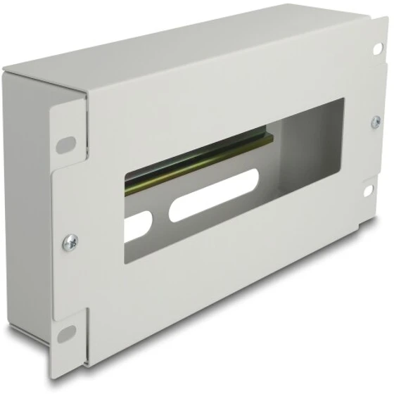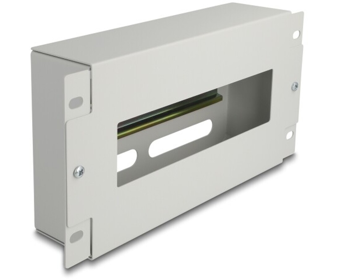 Listwa wyłącznikowa ze zintegrowaną szyną DIN marki Delock przeznaczona do montażu w szafach 10". Może być używana jako system montażowy, np. do zasilaczy, zacisków śrubowych i modułów interfejsów. Osłona chroni podłączone urządzenia, a otwór umożliwia łatwy dostęp do kabli. Produkt wyposażony w szynę DIN 35 mm oraz wejście kablowe, co ułatwia instalację i organizację kabli. Wykonany z metalu w kolorze szarym, doskonały do profesjonalnych zastosowań w szafach rackowych.