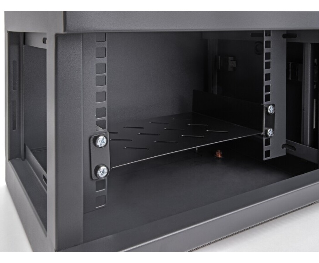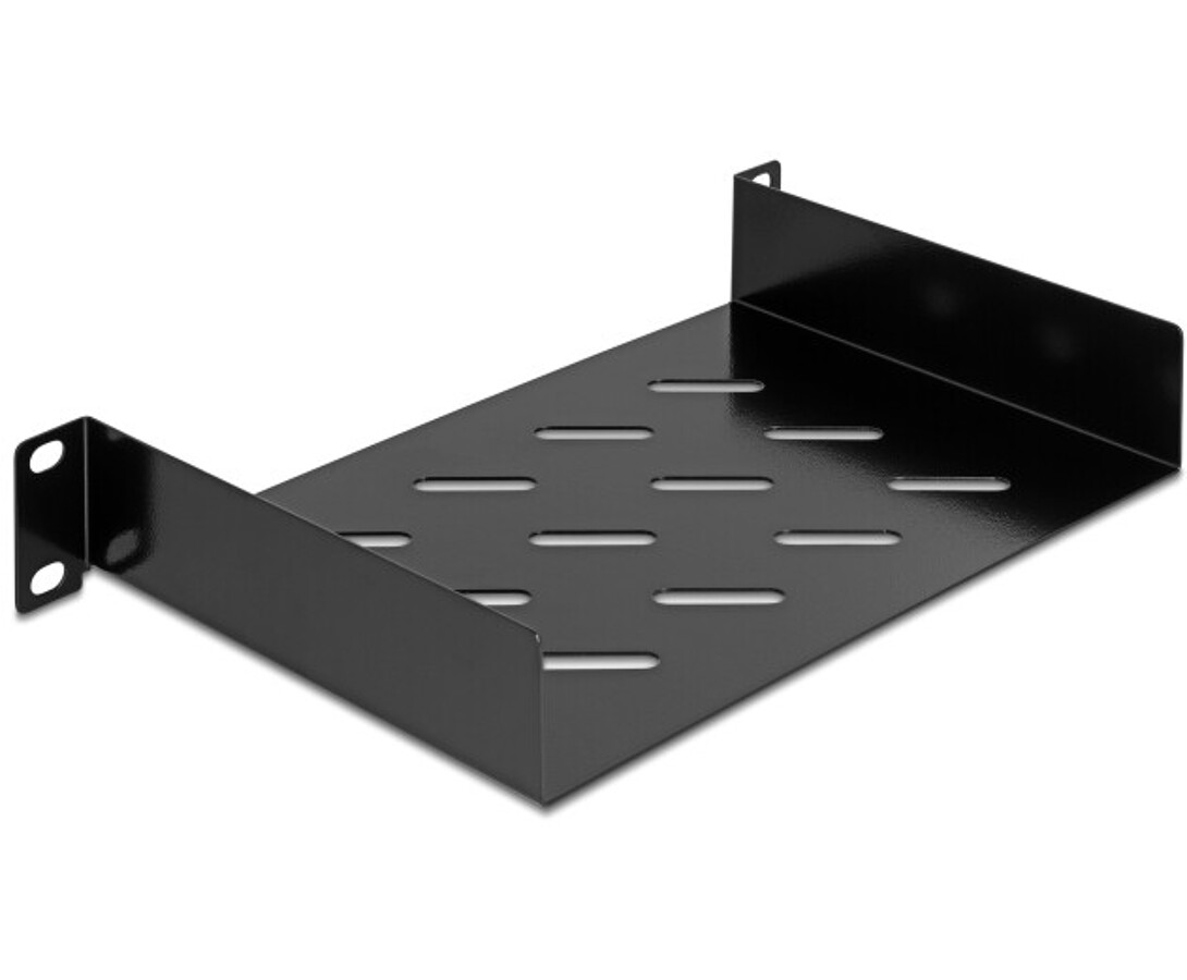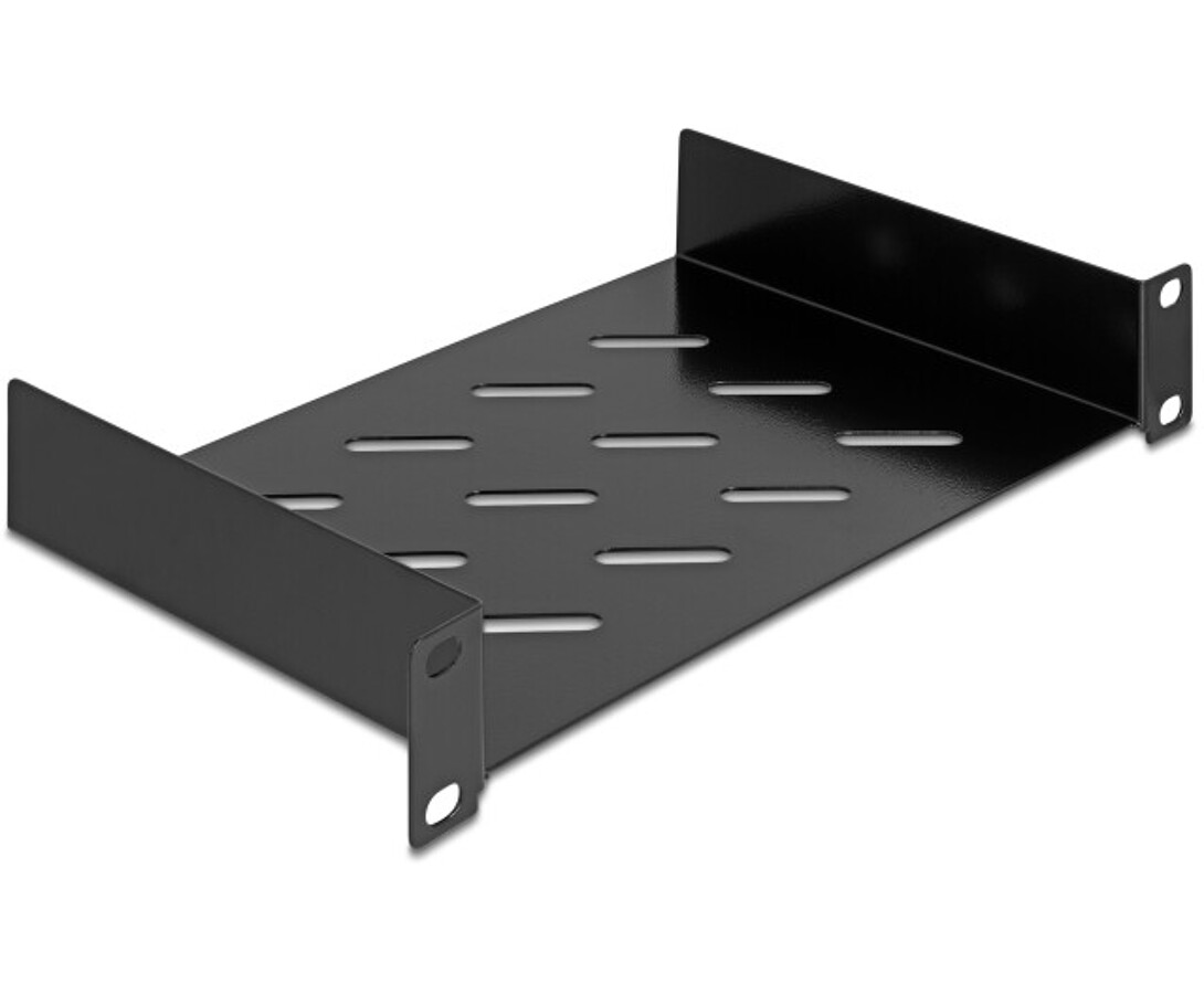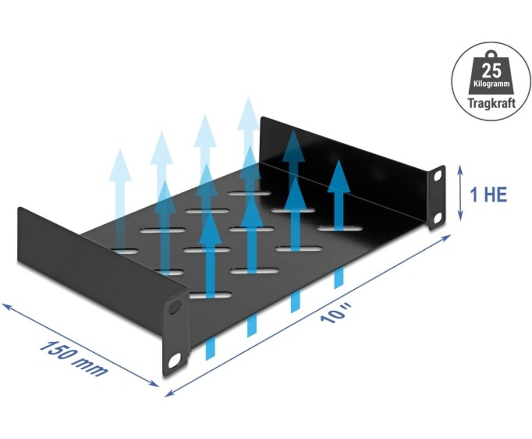 Półka 10" marki Delock przeznaczona do montażu w szafie sieciowej 10" to doskonała powierzchnia do przechowywania komponentów, które nie mogą być zainstalowane, zapewniając czystość i porządek w szafie sieciowej. Produkt oferuje powierzchnię o wymiarach 210 x 150 mm oraz maksymalne obciążenie do 25 kg. Półka wyposażona w otwory wentylacyjne, co zapewnia odpowiednią cyrkulację powietrza. Wykonana z blachy stalowej SPCC 1,0 mm z powłoką proszkową w kolorze czarnym, idealna do profesjonalnych zastosowań.