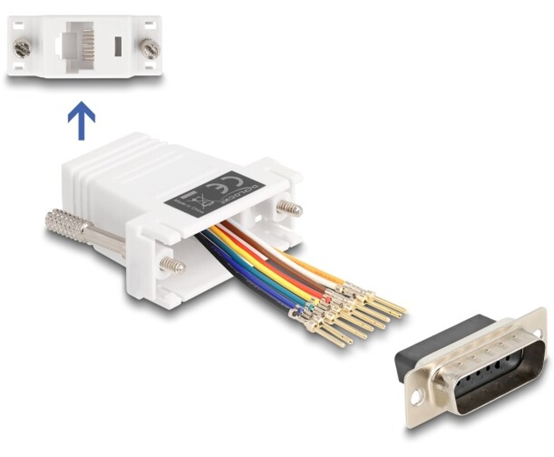 Przejściówka marki Delock umożliwia połączenie interfejsu szeregowego D-Sub 15 z gniazdem RJ45 przy użyciu kabla sieciowego Cat.5/5e/6. Konfigurowalne piny zapewniają pełną swobodę dopasowania połączeń do różnych urządzeń automatyki i telekomunikacji, gwarantując stabilność i niezawodność transmisji danych.