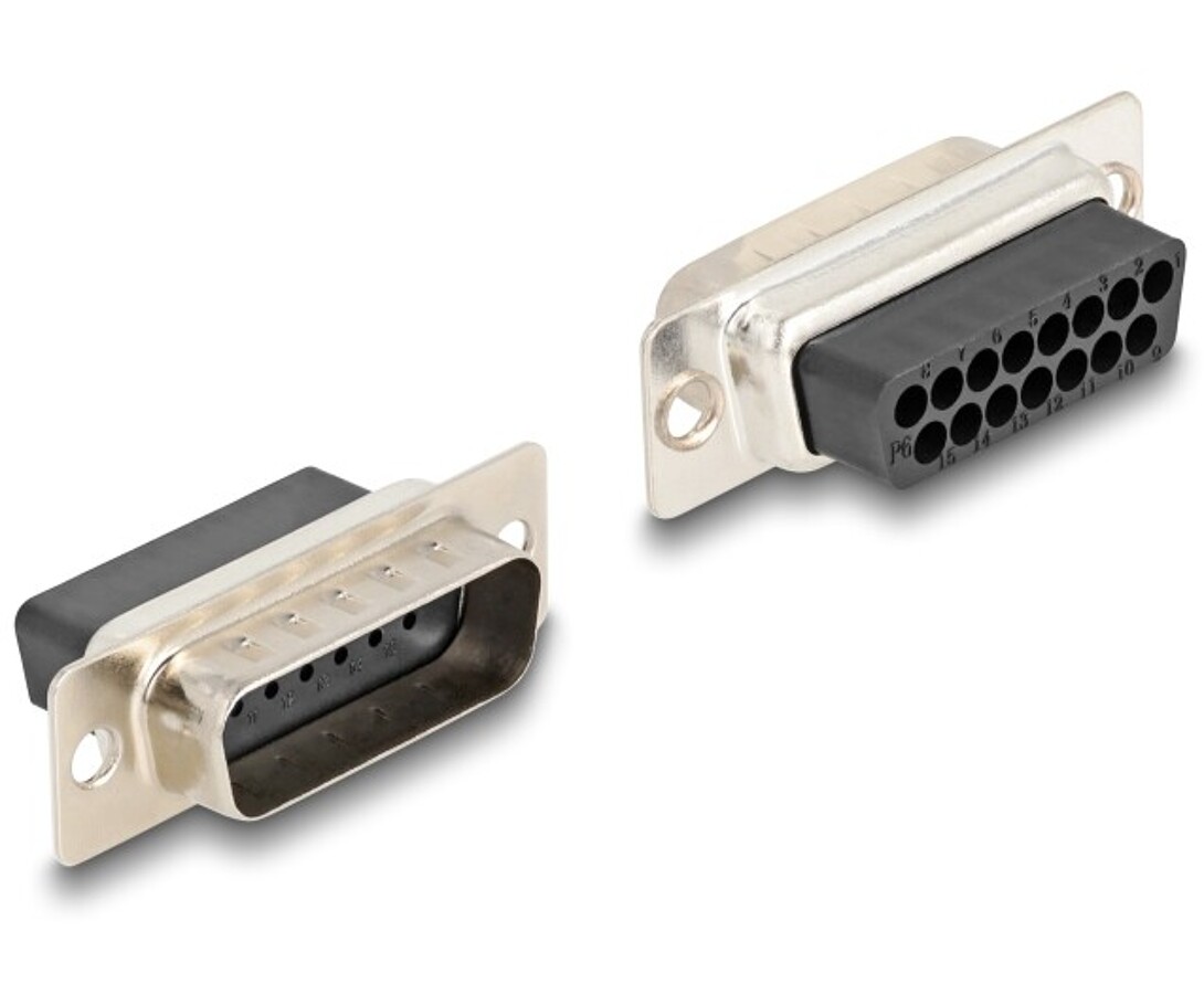 Złącze D-Sub HD Delock przeznaczone jest do zastosowań przemysłowych, automatyki i telekomunikacji, zapewniając niezawodne połączenie sygnałowe. Metalowa obudowa chroni przed zakłóceniami EMI i uszkodzeniami, a wysoka gęstość pinów gwarantuje precyzyjne lutowanie i trwałą transmisję danych w wymagających aplikacjach.
