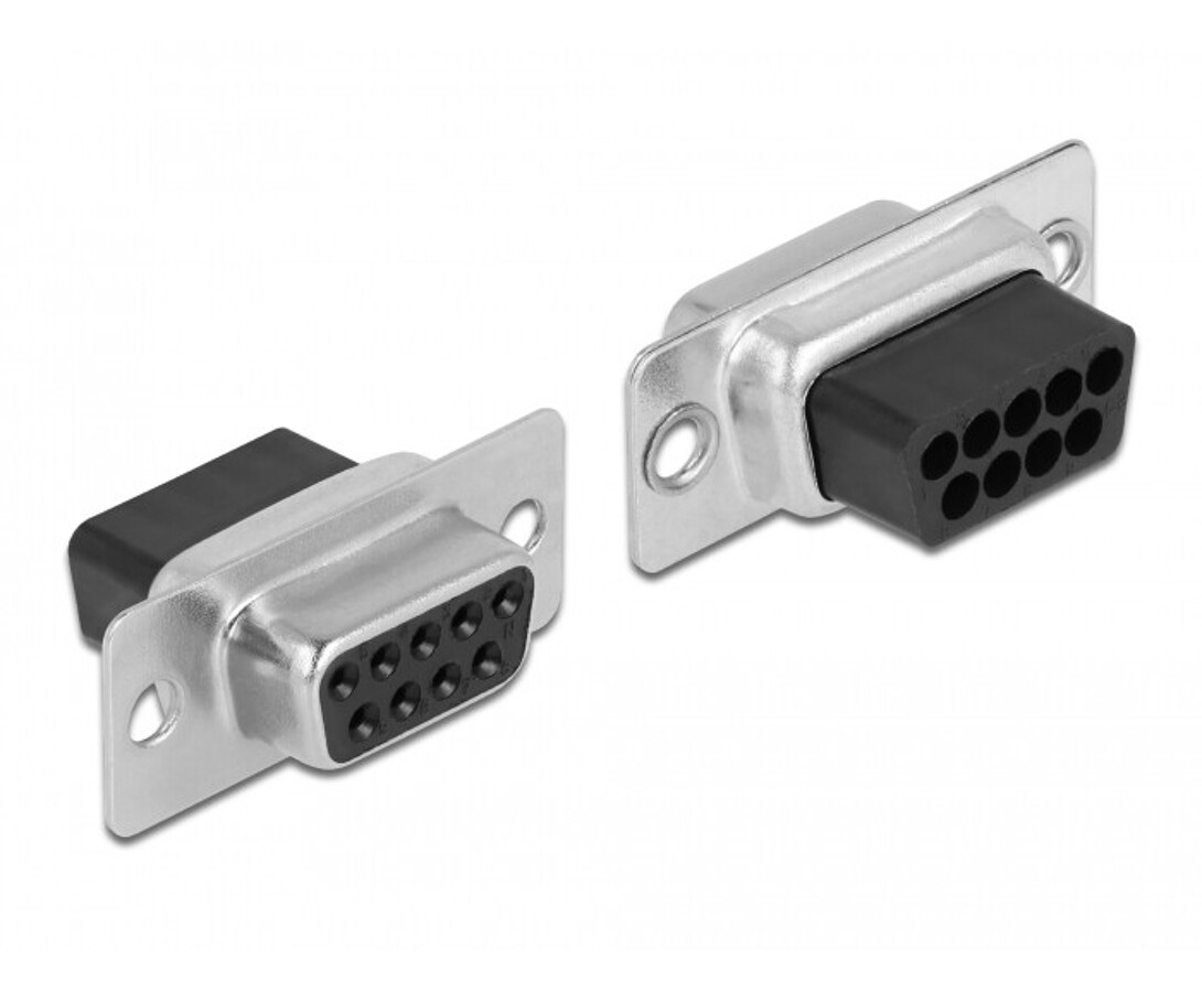 Złącze D-Sub HD 44 pin marki Delock w wersji żeńskiej przeznaczone do montażu lutowanego umożliwia tworzenie kompaktowych połączeń sygnałowych w urządzeniach przemysłowych i sterujących. Wykonane z metalu, zapewnia trwałość mechaniczną i wysoką odporność na zakłócenia elektromagnetyczne.