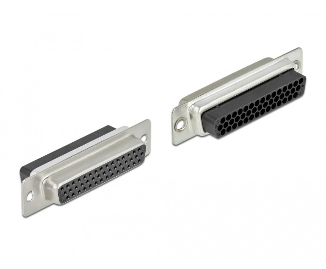 Złącze D-Sub HD 44 pin marki Delock w wersji żeńskiej przeznaczone do montażu lutowanego umożliwia tworzenie kompaktowych połączeń sygnałowych w urządzeniach przemysłowych i sterujących. Wykonane z metalu, zapewnia trwałość mechaniczną i wysoką odporność na zakłócenia elektromagnetyczne.