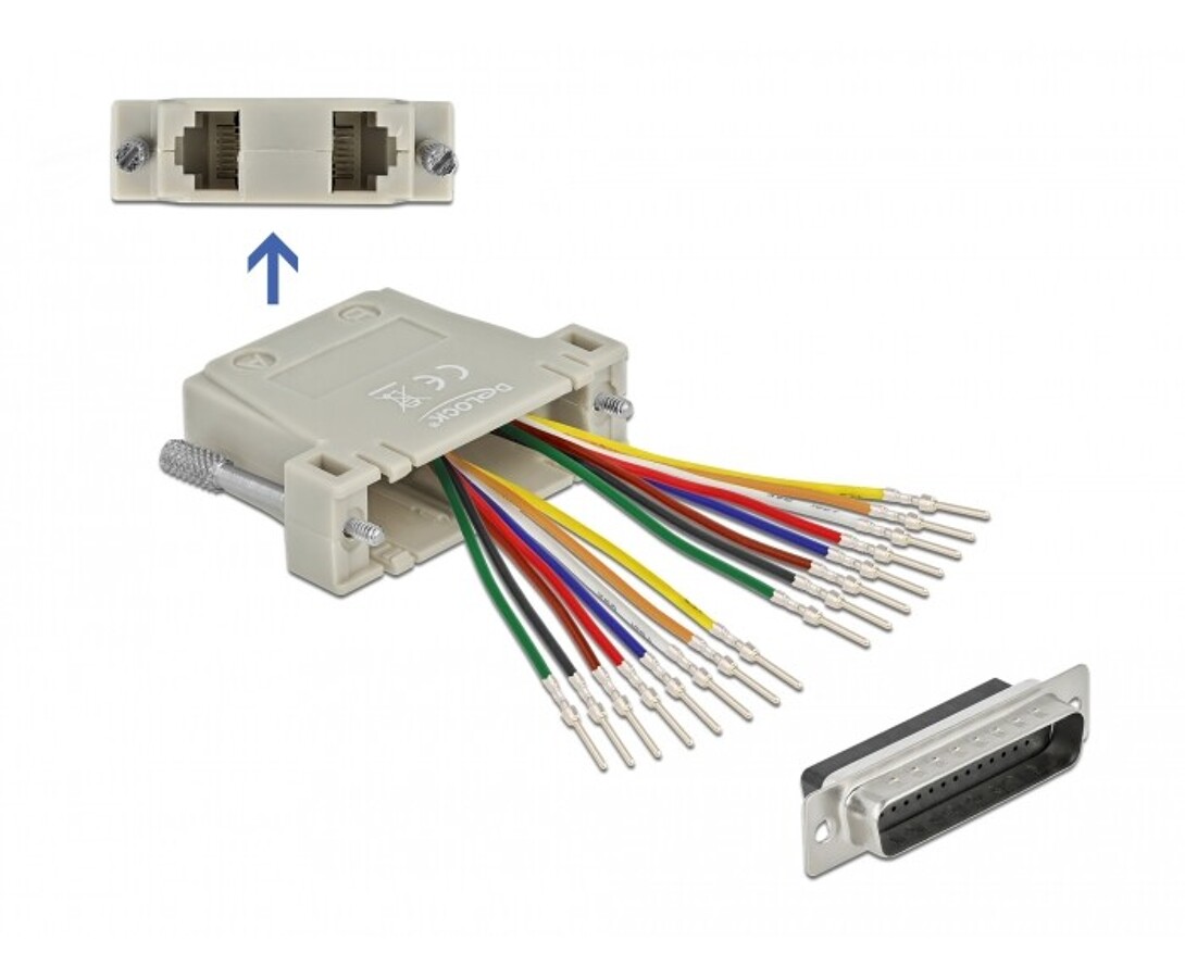 Przejściówka marki Delock umożliwia połączenie interfejsu szeregowego D-Sub 25 z gniazdem RJ45 przy użyciu przewodów sieciowych Cat.5/5e/6. Dzięki indywidualnie konfigurowanym pinom zapewnia elastyczność w dopasowaniu połączeń do różnych urządzeń automatyki i telekomunikacji, gwarantując stabilne i trwałe działanie.