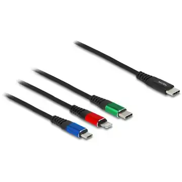 Kabel ładowarki Delock 3w1 to wszechstronne rozwiązanie, które umożliwia ładowanie urządzeń takich jak tablety, smartfony i inne urządzenia mobilne z interfejsami Lightning, Micro USB-B oraz USB typu C. Kabel eliminuje konieczność zabierania wielu kabli, a dzięki wytrzymałej tkanej osłonie oraz metalowym końcówkom, zapewnia stabilny przesył prądu do 3 A...