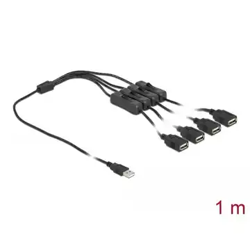 Kabel Delock umożliwia zasilanie do czterech urządzeń przez jeden port USB Typ-A. Wyposażony w cztery przełączniki on/off, pozwala na łatwe włączanie i wyłączanie zasilania, co eliminuje potrzebę odłączania kabla. Produkt obsługuje zasilanie o maksymalnej mocy 10 W (5 V / 2 A) i charakteryzuje się odpowiednią wytrzymałością, dzięki przewodowi 22 AWG.