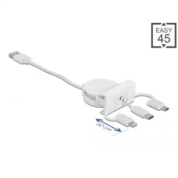 Zwijany kabel Delock Easy45 z końcówkami USB-A, Micro-B, USB-C™ i Lightning to praktyczne rozwiązanie do ładowania i przesyłu danych. Kompaktowy moduł pasuje do systemu Easy45 i może być montowany w obudowach oraz korytkach kablowych o głębokości minimum 45 mm.