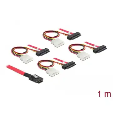 Kabel SAS marki Delock jest przeznaczony do łączenia wewnętrznych urządzeń SAS, takich jak kontroler z złączem Mini SAS, z 4 dyskami twardymi posiadającymi gniazdo SAS. Obsługuje specyfikację Serial Attached SCSI (SAS) z prędkością do 6 Gbps i ma długość około 1 m. Kabel wyposażony jest w 4 złącza SAS SFF-8482 (żeńskie) oraz 4 4-pinowe wtyki zasilania Molex.
