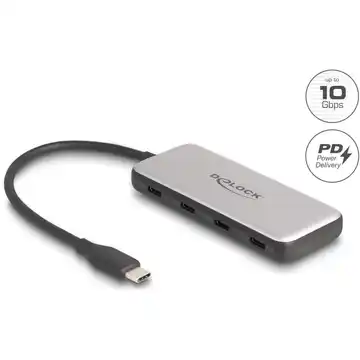 Hub USB marki Delock z interfejsem USB-C umożliwia podłączenie czterech urządzeń USB-C i ładowanie sprzętu z mocą do 85 W dzięki obsłudze Power Delivery. Zapewnia transfer danych do 10 Gbps, idealny do pracy z nowoczesnymi akcesoriami. Aluminiowa obudowa gwarantuje trwałość i mobilność, a funkcja Plug & Play umożliwia natychmiastowe działanie.