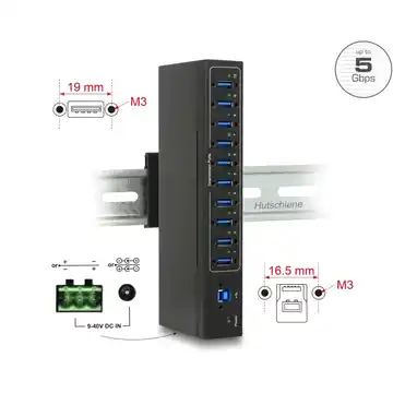 Przemysłowy hub USB marki Delock rozszerza komputer o dziesięć portów USB 5 Gbps Typu-A i zapewnia niezawodność w trudnych warunkach pracy. Wytrzymała metalowa obudowa, montaż ścienny i ochrona ESD do 20 kV gwarantują bezpieczne użytkowanie. Urządzenie może być zasilane z magistrali lub zewnętrznego źródła 9–40 V, oferując pełną elastyczność.