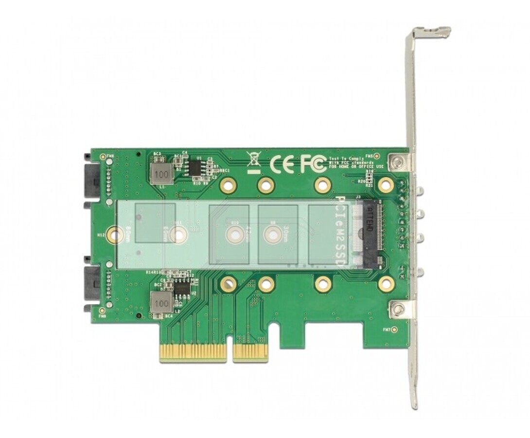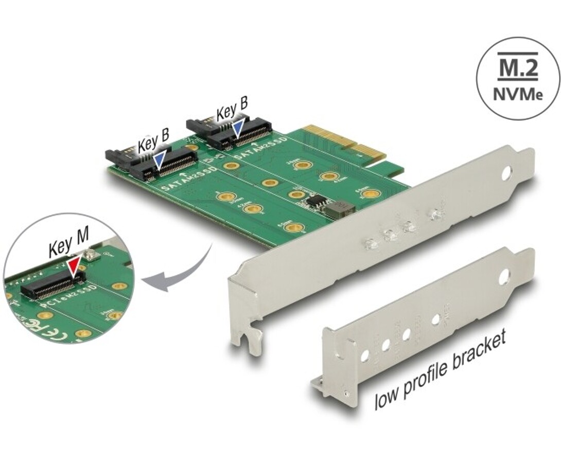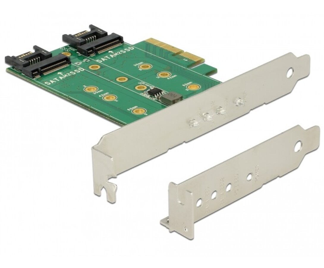 Karta PCI Express marki Delock rozbudowuje komputer osobisty o trzy gniazda M.2, umożliwiając podłączenie do dwóch modułów M.2 SATA w formatach 2280, 2260, 2242 i 2230 oraz jednego modułu M.2 PCIe w formatach 2280, 2260, 2242, 2230. Moduły SATA podłączane są do płyty głównej przy użyciu przewodów SATA, a karta obsługuje jednocześnie wszystkie złącza zapewniając szybki dostęp do pamięci.