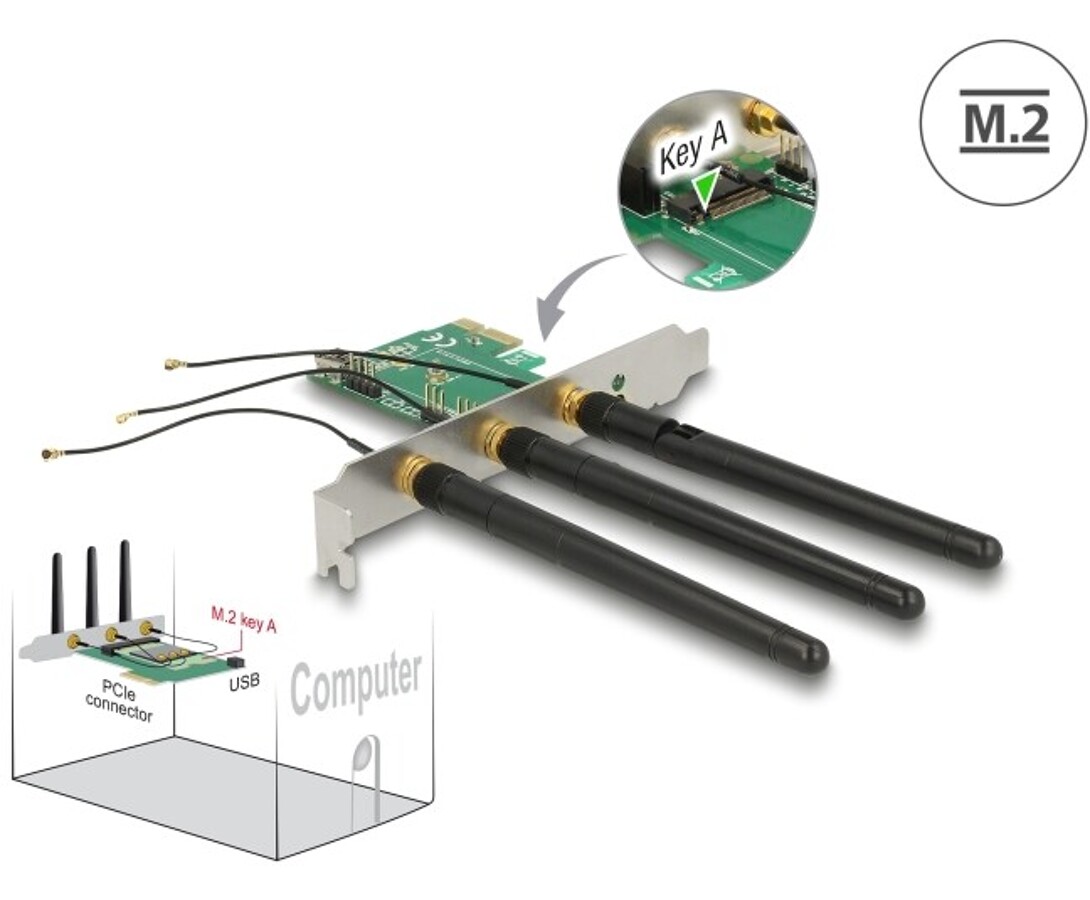 Karta PCI Express marki Delock rozbudowuje komputer osobisty o jedno gniazdo M.2 z wpustem A, umożliwiając podłączenie modułów M.2 z sygnałem USB oraz PCIe. Karta obsługuje moduły WLAN, Bluetooth, GNSS, 3G, HSPA oraz NFC, umożliwiając jednoczesne korzystanie z funkcji modułu, np. WLAN i Bluetooth. Moduły USB podłączane są do systemu poprzez złącze USB na karcie, a w razie potrzeby można zmienić antenę i przewody antenowe.